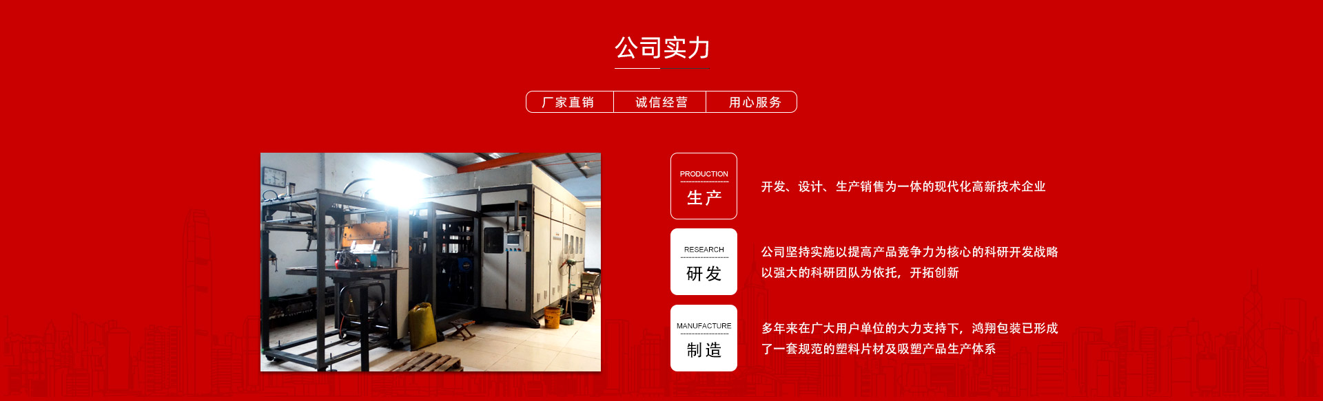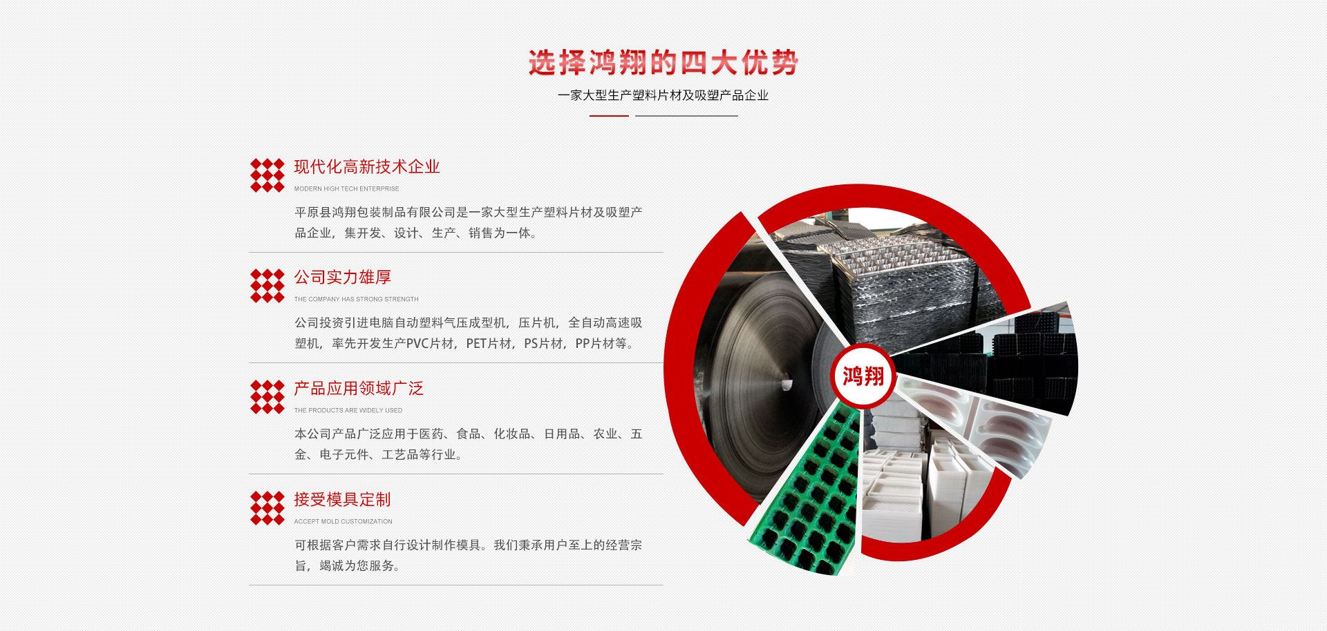 平原縣鴻翔包裝制品有限公司是一家大型生產(chǎn)塑料片材及吸塑產(chǎn)品企業(yè),本公司投資引進(jìn)電腦自動塑料氣壓成型機(jī),壓片機(jī),全自動高速吸塑機(jī),率先開發(fā)生產(chǎn)PVC片材,PET片材,PS片材,PP片材等,鴻翔是國內(nèi)先進(jìn)的生產(chǎn)廠家之一。本公司產(chǎn)品廣泛應(yīng)用于醫(yī)藥、食品、化妝品、日用品、農(nóng)業(yè)、五金、電子元件、工藝品等行業(yè),也可根據(jù)客戶需求自行設(shè)計制作模具。本公司技術(shù)力量雄厚,生產(chǎn)設(shè)備工藝先進(jìn)。我們秉承用戶至上的經(jīng)營宗旨,竭誠為您服務(wù)。